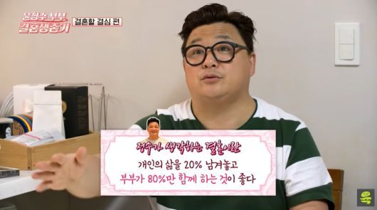윤정수는 혼인신고를 마친 아내를 두고 '현재 몇 퍼센트 삶에 들어왔나'라는 질문을 받고 "원래 내 삶이 100이었다가 그녀와 함께 하는 삶이 60~80 정도가 되고, 20 정도 남겨 놓고