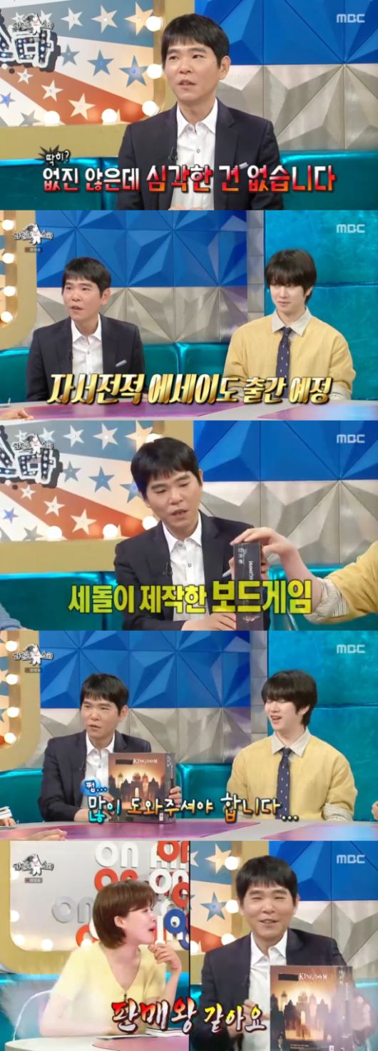 이세돌은 근황을 묻자 "보드게임 작가로도 활동하고 있고, 제가 쓴 책도 나왔다"면서 MC들에게 책을 선물했다. 이어 자신이 만든 보드게임까지 꺼내면서 "많이 도와주셔야 할 것 같다"면서 보드게임도 선물로 건넸다.