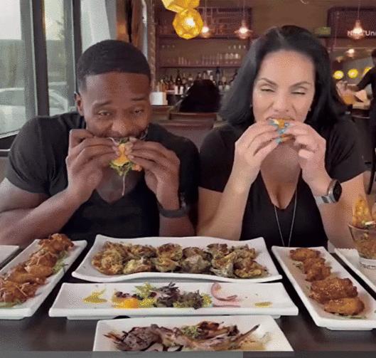 니나 산티아고와 패트릭 블랙우드는 연어, 굴, 랍스터 등 푸짐한 요리와 함께 햄버거를 먹고 있었다.