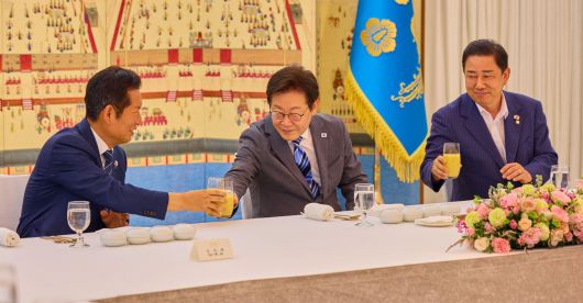 당지도부와 2시간 회동 이재명 대통령이 20일 서울 용산구 한남동 관저에서 열린 더불어민주당 신임 지도부와의 만찬에서 정청래 대표(왼쪽), 김병기 원내대표(오른쪽)와 주스로 건배를 하고 있다. 당정대는 이날 추석 전까지 검찰청 폐지 등을 담은 정부조직법 개정안을 처리하겠다고 밝혔다. 대통령실 제공 |