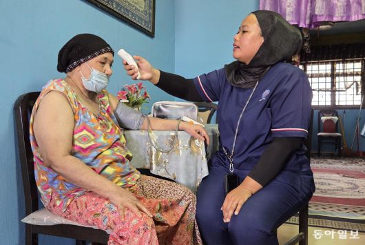싱가포르 베독 공공아파트 단지 내 자밀라 씨(사진 왼쪽) 자택에서 베독 AAC 소속 방문 간호사가 자밀라 씨 혈압을 재고 있다. 자밀라 씨는 3년 전 치매 진단을 받았지만 AAC로부터 일상 전반을 관리받으며 자택에서 계속 살고 있다. 싱가포르=조유라 기자 jyr0101@donga.com