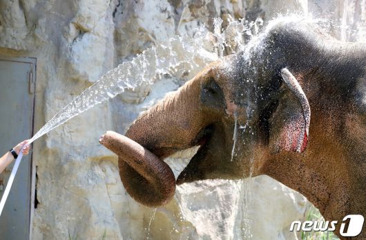 21일 폭염특보가 발령된 대전·충남은 최고 체감온도 33~35도 안팎의 폭염이 이어질 것으로 예보됐다. 대전 중구 오월드에서 사육사가 코끼리에게 물을 뿌려주며 더위를 식혀주고 있다. /뉴스1 ⓒ News1 김기태 기자 |