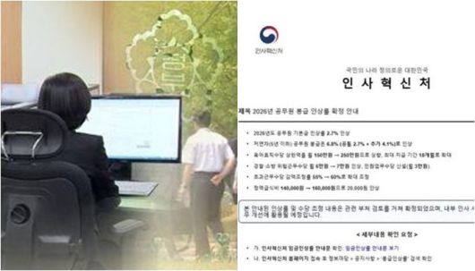 한편 인사혁신처는 내년 공무원 임금 인상안에 대한 최종 결정을 앞두고 있다. 인사혁신처 산하 공무원보수위원회(공보위)는 지난달 21일 2026년도 공무원 임금 인상률을 2.7~2.9%로 결정했다.