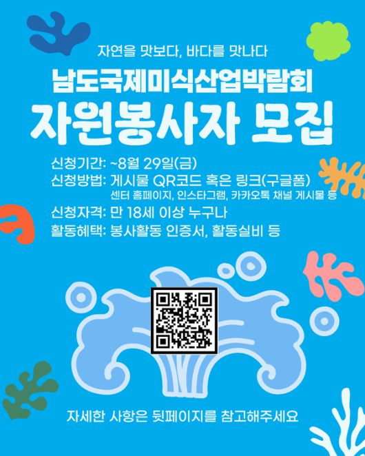 [백현석 기자] (문화뉴스 백현석 기자) 전라남도자원봉사센터(센터장 김상길)가 8월 29일 까지 '남도국제미식산업박람회'에서 활동할 자원봉사자 880여명을 모집한다.