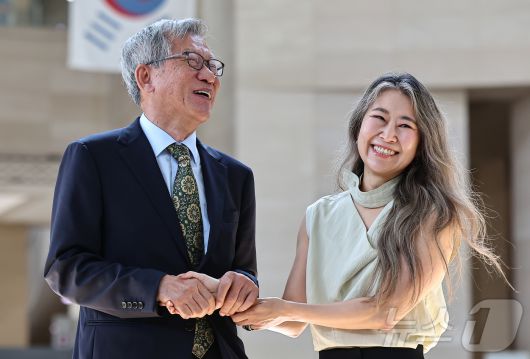 (서울=뉴스1) 김도우 기자 = 유홍준 국립중앙박물관장과 넷플릭스 애니메이션 영화 '케이팝 데몬 헌터스'의 메기 강 감독이 21일 서울 용산구 국립중앙박물관에서 만나 인사를 나누고 있다. 2025.8.21/뉴스1