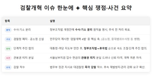 앞서 민주당은 검찰청 폐지와 공소청 신설, 중대범죄수사청 신설, 국가수사위원회 신설 법안 등 ‘검찰개혁 4법’을 추석 전 본회의에서 처리하겠다고 밝힌 바 있다. 정청래 대표는 당대표 수락연설에서 “한가위 귀향길에는 검찰청 폐지 뉴스가 들려오도록 하겠다”고 공언하기도 했다.