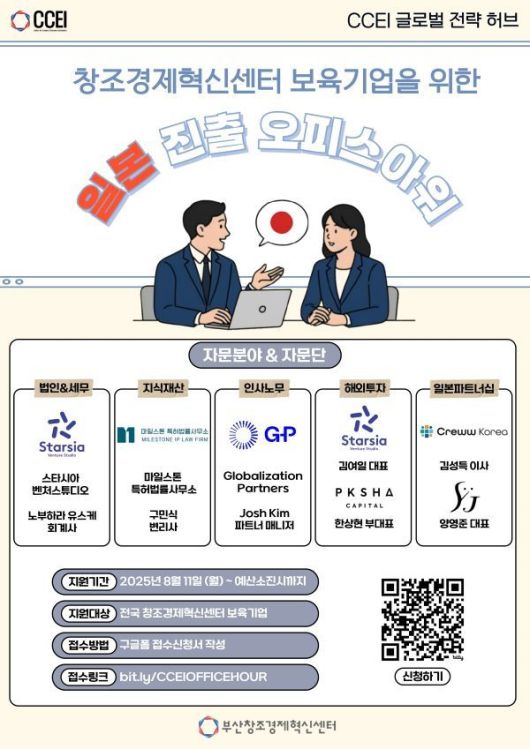 인더뉴스 제해영 기자ㅣ부산창조경제혁신센터(이하 부산창경)는 일본 진출을 희망하는 창조경제혁신센터 보육기업을 대상으로 ‘일본 진출 오피스아워’ 프로그램을 운영한다고 21일 밝혔습니다.