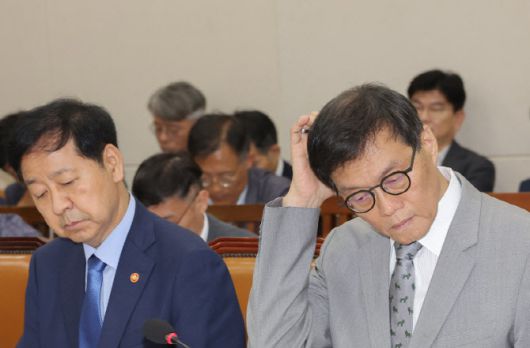 구윤철 경제부총리 겸 기획재정부 장관(왼쪽)과 이창용 한국은행 총재가 19일 국회에서 열린 기획재정위원회 전체회의에 참석해 있다. (사진=연합뉴스) |