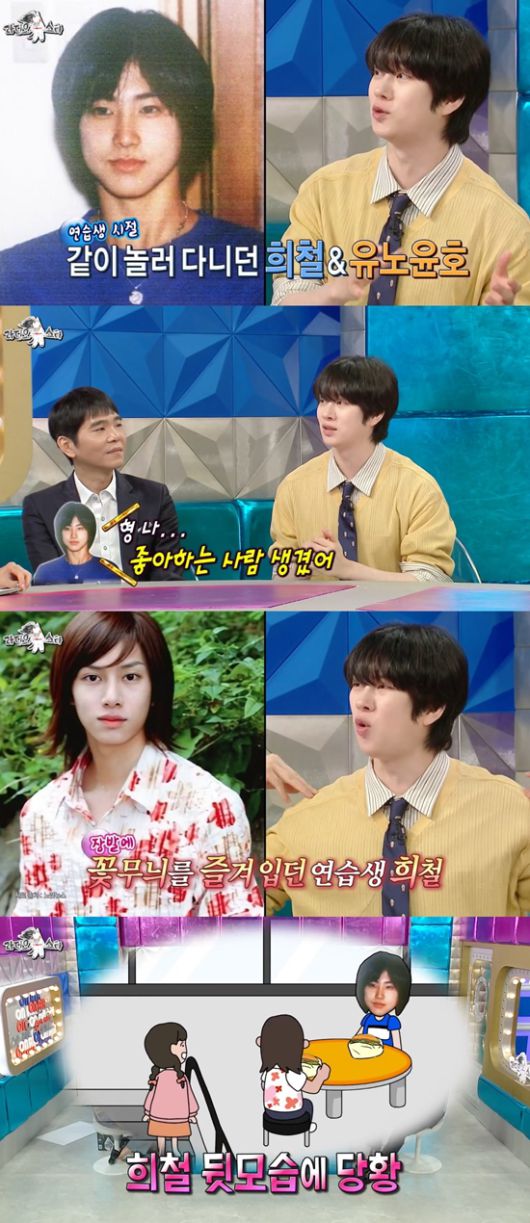 김희철은 "저랑 유노윤호 씨가 연습생이었을 때 압구정 로데오 거리에 엄청 큰 햄버거 가게가 있었다. 2층에 저랑 윤호랑 앉아서 햄버거를 먹으려고 하는데 윤호가 '형 좋아하는 사람이 생겼다'라고 했다. 윤호가 그때 고등학생이었고 소개해 주고 싶다고 했다"라며 연습생 당시 일화를 공개했다.