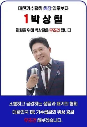 [서울=뉴스핌] 오광수 문화전문기자 = '무조건'으로 유명한 가수 박상철이 대한가수협회 제8대 회장에 당선됐다. 대한가수협회는 20일 서울 영등포구 협회 사무처에서 열린 제8대 임원 선거에서 박상철이 128표를 얻어 당선됐다고 21일 밝혔다. 임기는 4년이다. 총 투표인 수는 228표로 함께 출마한 최유나는 100표를 얻었다.