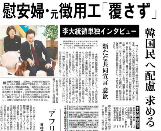 이재명 대통령과 단독 인터뷰를 실은 21일치 일본 요미우리신문 1면. 지면 갈무리 |