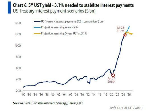 미국 정부가 지불하는 연간 이자비용 추이(남색, 단위: 10억달러)와 현재 시장금리 수준이 유지될 경우(파란색), 5년물 국채 금리를 3.1%로 고정할 경우(노란색)의 각각 추이 [자료=뱅크오브아메리카] |