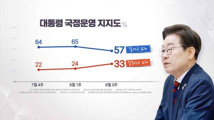 엠브레인퍼블릭과 케이스탯리서치, 코리아리서치와 한국리서치가 지난 18일부터 20일까지 만 18세 이상 남녀 1,001명을 대상으로 전국지표조사(NBS)를 실시한 결과, 이 대통령이 국정 운영을 '잘하고 있다'는 답변은 57%로, 직전 조사인 2주 전보다 8%p 떨어졌습니다.