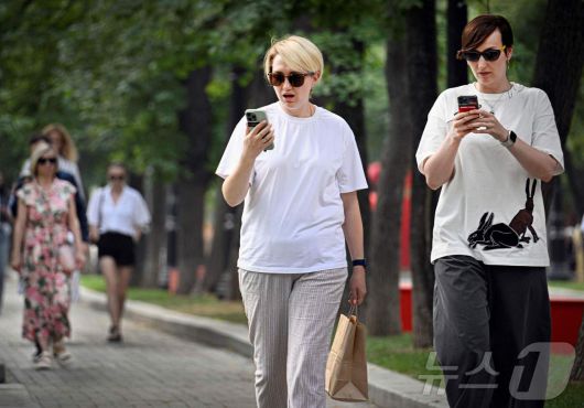 (모스크바 AFP=뉴스1) 권영미 기자 = 2025년 7월 30일 러시아 모스크바에서 선글라스를 착용한 보행자들이 스마트폰을 사용하는 모습. 러시아는 최근 언론의 자유와 온라인 표현의 자유를 대대적으로 제한했으며, 새로운 법률에 따라 당국이 ‘극단주의적’이라고 판단한 웹페이지, 서적, 예술 작품, 음악 앨범 등을 검색한 인터넷 사용자에게 벌금을 부과할 수 있게 됐다. 2025.07.30. ⓒ AFP=뉴스1