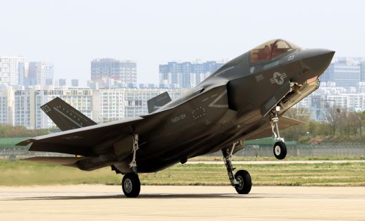 지난 4월18일 광주 광산구 공군 광주기지에서 열린 한미 공군 연합공중훈련 ‘프리덤 플래그’에서 스텔스기 F-35가 비행을 마치고 착륙하고 있다. 연합뉴스 |