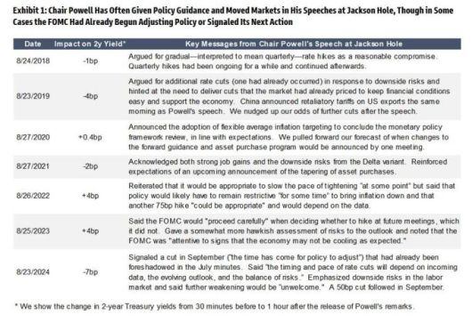 파월 의장의 과거 잭슨홀 연설이 시장에 미친 영향 정리, 2년물 미국 국채 금리의 변화(연설 30분 전부터 1시간 후까지의 변화)와 파월 의장 연설의 핵심 메시지 [자료=골드만삭스] |