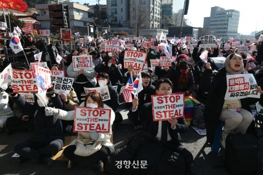고위공직자범죄수사처가 윤석열 대통령에 대한 체포영장 집행을 시도했다 실패한 다음날인 1월4일 서울 용산구 한남동 관저 인근에서 대통령 탄핵 반대 집회가 열리고 있다. 정효진 기자 |