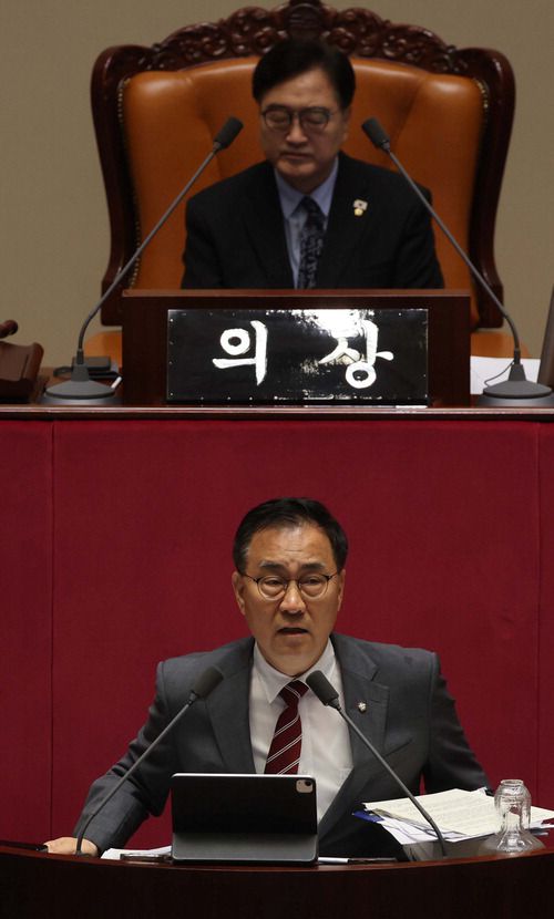 최형두 국민의힘 의원(아래)이 21일 서울 여의도 국회에서 열린 본회의에서 한국교육방송공사법(EBS법) 개정안 본회의 의결을 막기 위한 무제한 토론을 장시간 이어가고 있다. 한주형 기자 |