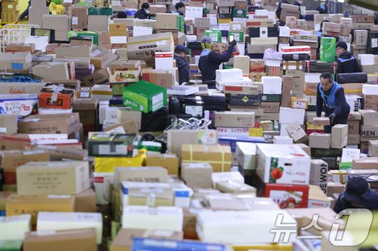 서울 광진구 동서울우편물류센터에서 직원들이 택배 분류 작업으로 구슬땀을 흘리고 있다. 2025.1.21/뉴스1 ⓒ News1 신웅수 기자 |