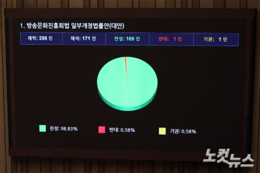 21일 서울 여의도 국회 제428회국회(임시회) 제1차 본회의에서 방송문화진흥회법 일부개정법률안(대안)이 재석 171인, 찬성 169인, 반대 1인, 기권 1인으로 가결되고 있다. 윤창원 기자 |