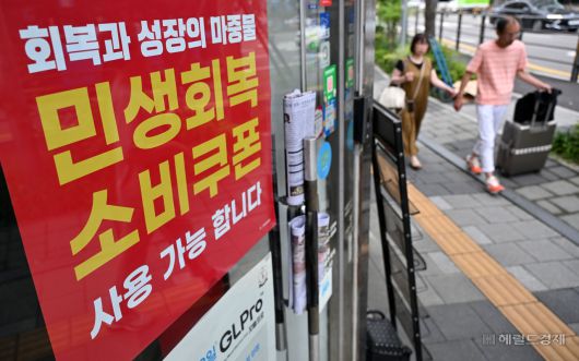 지난달 21일 오전 서울 중구의 한 상점에 민생회복 소비쿠폰 사용가능 안내문이 부착되어 있다. [임세준 기자] |