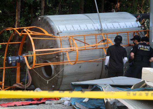 ‘사고 현장’ 간이탱크 눕혀놓고 조사 경찰 과학수사팀 관계자들이 21일 노동자들이 내부 청소 작업 중 질식돼 숨진 전남 순천시 한 레미콘공장 내 간이탱크를 조사하고 있다. 이 탱크는 원래 세워져 있었지만 소방당국이 구조 과정에서 옆으로 눕혔다. 왼쪽 하단에 보이는 동그란 구멍을 통해 작업자들이 드나들었다. 연합뉴스