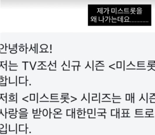 최준희는 지난 20일 개인 SNS를 통해 제작진으로부터 받은 DM을 공개하며 “제가 ‘미스트롯’을 왜 나가는데요”라고 짧지만 강한 불편한 심경을 드러냈다.