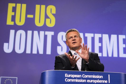 마로시 셰프초비치 EU 무역·경제안보 담당 위원이 21일(현지시간) 벨기에 브뤼셀 EU 본부에서 열린 기자회견에서 발언하고 있다. AP연합뉴스 |