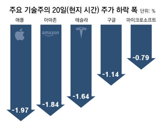 이 영향으로 뉴욕 증시가 사흘째 혼조세를 보였다. 20일 뉴욕증권거래소(NYSE)에 따르면 기술주 중심의 나스닥지수는 전 거래일 대비 0.67% 떨어진 21,172.86에 장을 마쳤다. 마이크로소프트(MS)와 애플은 각각 0.79%, 1.97% 떨어졌고, 구글과 아마존 주가도 각각 1.14%, 1.84% 하락했다. 페이스북 모회사 메타와 테슬라도 각각 0.50%, 1.64% 떨어졌다.