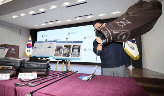 21일 오전 서울 강남구 서울세관에서 진행된 한국-필리핀 도박자금 환치기 조직 검거 브리핑에서 관세청 직원이 골프백을 들고 은닉 사례를 시연하고 있다. 이번에 검거된 환치기 일당은 1155억 원 상당의 달러를 필리핀으로 밀반출한 혐의를 받는다. 뉴시스 |