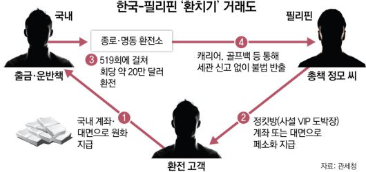 한국과 필리핀을 오가며 1400억 원 상당의 불법 환치기를 벌인 조직이 세관 당국에 덜미를 잡혔다. 이들은 현지 정킷방에 상주하면서 소셜네트워크서비스(SNS) 단체 대화방을 통해 도박 자금이 필요한 한국인 고객을 모집하고 한국에서 원화로 대금을 받은 뒤 이를 환전해 필리핀으로 밀반출해 고객에게 지급해 온 것으로 드러났다.