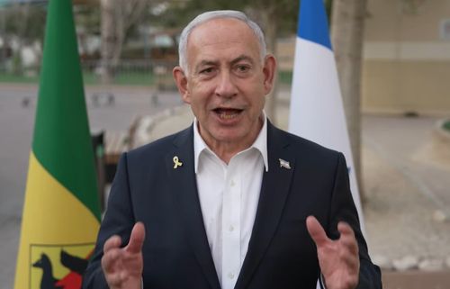 21일(현지시간) 가자지구에서 발언하는 베냐민 네타냐후 이스라엘 총리 |