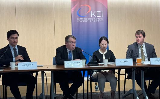21일 미국 워싱턴 DC에서 열린 한미경제연구소(KEI) 기자회견에서 스콧 스나이더 소장(왼쪽에서 두번째)이 발언을 하고 있다. 왼쪽부터 아리우스 데어 커뮤니케이션 담당 디렉터, 스나이더, 앨런 김 학술 담당 디렉터, 토머스 래미지 경제 정책 분석가. /워싱턴=김은중 특파원 |