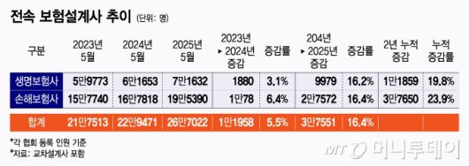 21일 생명·손해보험협회에 따르면 생명보험사 전속 설계사 수는 2024년 5월 6만1653명에서 올해 5월 7만1632명으로 16.2%(9979명) 증가했다. 같은 기간 손해보험사 전속 설계사 수는 16만7818명에서 19만5390명으로 16.4%(2만7572명) 늘었다. 합산하면 최근 1년 동안 3만7551명의 전속 설계사가 새로 유입된 것이다.