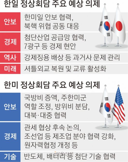 이번 한미 정상회담 의제로는 국방비 인상을 비롯해 주한미군 전략적 유연성 확대 등 동맹 현대화 및 관세 협상 후속조치, 동맹의 기여 강화 등 전 분야에 걸친 논의가 예상된다. 김정관 산업통상자원부 장관은 22일 출국해 크리스 라이트 에너지부 장관을 만나 협력 방안을 논의할 계획이다. 앞서 여한구 통상교섭본부장은 지난 20일 출국했다.