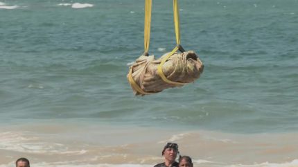 잠수부들까지 동원해 조심스럽게 인양한 것은 머리와 다리가 없는 2.17m 크기의 화강암 조각상입니다.