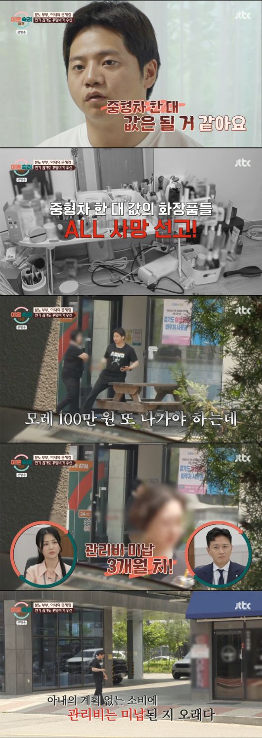 남편은 아내가 중형차 한 대 값에 달하는 돈을 화장품에 썼다고 말했다. 관리비가 두 달 넘게 밀린 상황에서도 14만 원짜리 퍼스널 컬러 진단을 받은 아내의 소비 패턴에 남편은 "눈 감았다 뜨면 어떻게 20~30만 원이냐"며 답답함을 호소했다. 아내는 이에 대해 "그게 제 유일한 낙"이라고 말했다.