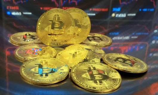 비트코인 모형이 놓인 바닥에 코인 시세 그래프가 비치는 모습. /뉴스1 |