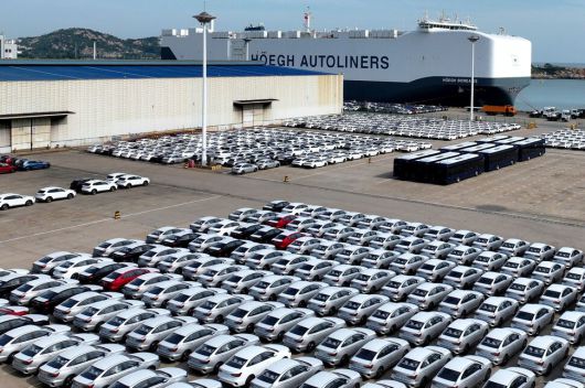 20일 중국 동부 장쑤성 롄윈강 항구에서 수출을 위해 선적 준비 중인 자동차들. 롄윈강/신화 연합뉴스 |