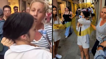 한 관광객이 길거리 한복판에서 10대 소녀의 머리카락을 움켜쥔 채 소리를 지릅니다.
