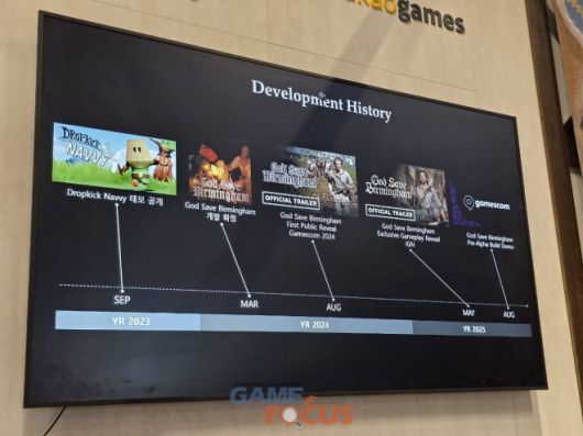 차 디렉터는 현재까지 개발과정에 대한 이야기도 이었다. 갓 세이브 버밍엄은 원래 '드롭킥 나비'라는 작은 파일럿 프로젝트에서 출발했다. 당시에는 아주 제한된 리소스로 진행한 실험적 게임이었는데, 이 과정에서 '물리 엔진을 활용한 서바이벌'이라는 핵심 아이디어가 생겼고, 이후 이 아이디어를 보다 확장해 중세라는 테마와 결합하면서 지금의 게임이 탄생했다.