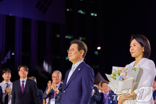 이재명 대통령과 부인 김혜경 여사가 지난 15일 서울 세종대로 광화문광장에서 열린 '광복 80년, 국민 주권으로 미래를 세우다' 제21대 대통령 국민 임명식에 참석해 있다. (대통령실 제공. 재판매 및 DB금지) 2025.8.16/뉴스1 ⓒ News1 이재명 기자 |