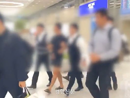 해킹 범죄조직의 총책급 범죄인인 중국 국적 A씨(가운데)가 22일 오전 5시5분 태국 방콕에서 인천국제공항으로 송환돼 입국하고 있다. 법무부 제공 |