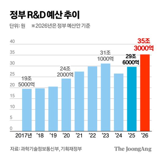 이재명 정부가 22일 내년도 정부 연구개발(R&D) 예산안을 역사상 최대 규모인 35조3000억원 규모로 심의·의결했다. 윤석열 정부 때인 2024년 26조5000억원까지 줄어든 예산을 대폭 늘린 것이다.