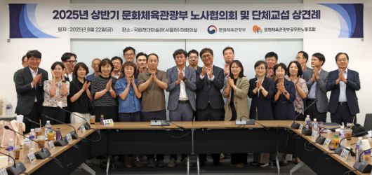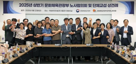 [이데일리 김미경 기자] 최휘영 문화체육관광부 장관이 22일 서울 종로구 국립현대미술관 서울관 회의실에서 열린 ‘2025년 상반기 문화체육관광부 노사협의회 및 단체교섭 상견례’에 참석해 임석빈 문체부 노조위원장을 비롯한 지부장들과 함께 기념촬영을 하고 있다. (사진=문체부 제공).