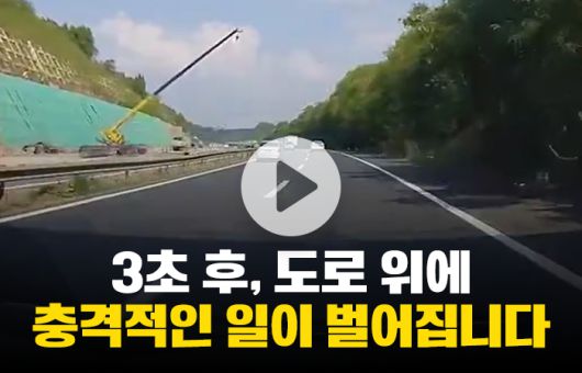 1차로에서 주행하던 차량의 바로 앞에 크레인이 떨어진 상황. 해당 차량은 순간적으로 방향을 틀어 크레인과의 충돌을 피한 뒤 멈췄습니다.