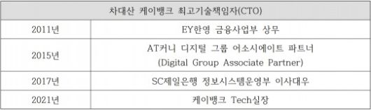 차 실장은 포항공대 컴퓨터공학과를 졸업했으며 ▲2011년 EY한영 금융사업부 상무 ▲2015년 AT커니 디지털 그룹 어소시에이트 파트너 ▲2017년 SC제일은행 정보시스템운영부 이사대우 등을 역임했다.