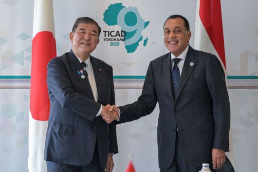 이시바 시게루 일본 총리(왼쪽)가 도쿄 남부 요코하마에서 열린 제9차 아프리카개발회의(TICAD) 마지막 날인 22일 무스타파 마드불리 이집트 총리와 악수를 나누고 있다. AFP연합뉴스 |