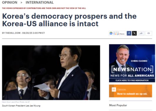 더힐에 실린 이재명 대통령에 대한 고든 창 변호사의 지난 15일(현지시간) 기고문. 사진 더힐 홈페이지 캡처 |