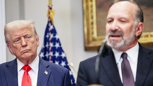도널드 트럼프 미국 대통령이 지난 3월 미국 워싱턴 DC 백악관에서 하워드 러트닉 미국 상무부 장관(오른쪽)이 대만 TSMC의 투자에 대해 발표하는 모습을 지켜보고 있다. 로이터=연합뉴스 |